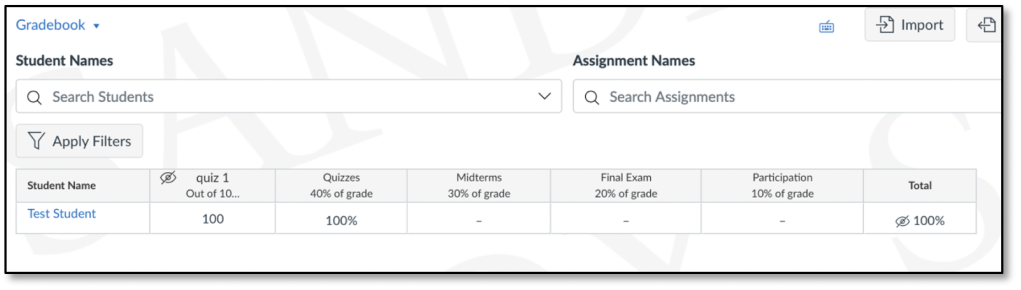 Do not leave a box blank for a student who misses a quiz. Give the student 0. Canvas uses available numbers to calculate final grades. For instance, if a student gets 100 on two quizzes but misses the other 8, and if you leave those other 8 as blanks rather than giving them 0, Canvas will give the student 100% for quizzes. To drop some number of lowest quizzes, see two images above where you weighed groups.
