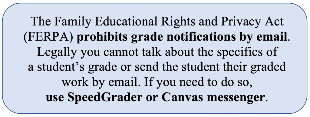 To add an assignment, like a quiz, as I have done above, click the + to the right side of the group header (just right of the “X% of Total” notice), not the big blue Assignment button above the groups. I assign 100 points to all quizzes, no matter their length, entering the percentage as the grade, not the raw points (e.g. 7 of 8 and 14 or 16 raw points both equal 87.5/100). This means that items on one quiz may weigh more or less than items on another, but it allows students to keep more easy track of their grade. In fact, I have received complaints when I haven’t done grades this way. You are welcome to distinguish between, say, longer (100 points) and shorter (50 points) quizzes if you wish, but you should note the distinction in your syllabus and still enter grades as percentages, not raw points. I would not get more complicated than that.