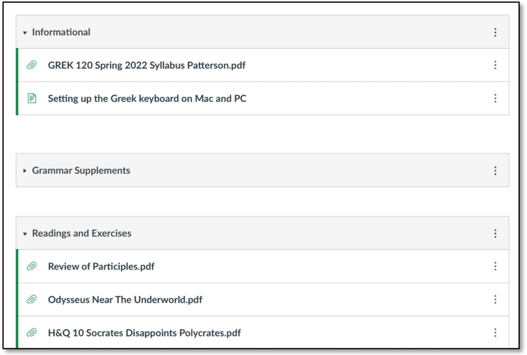 As for course documents, use Modules to organize and present them. As far as I am aware, there is no good way to organize the Files page, where your uploaded docs are stored. Modules lets you control what students see and how, and you can still link to docs in your files in an announcement (see above). This is how the Modules page for my GREK 120 (Spring 2021) looked: