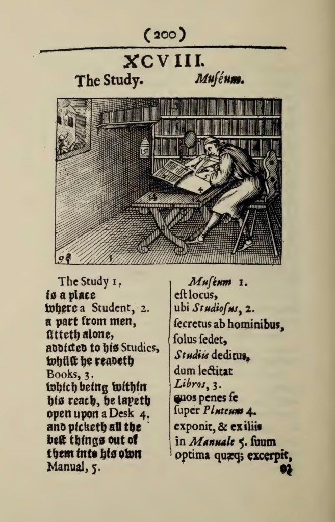 In their first year of study, students memorized definitions through extensive repetition. The second year was dedicated to building vocabulary. Books like John Amos Comenius’ Orbis Sensualium Pictus helped with this. First published in 1657 with an English translation by Charles Hoole in 1659, Comenius’ was one of the first children’s picture books. Its focus on both daily life and morality made it a particularly attractive school text: