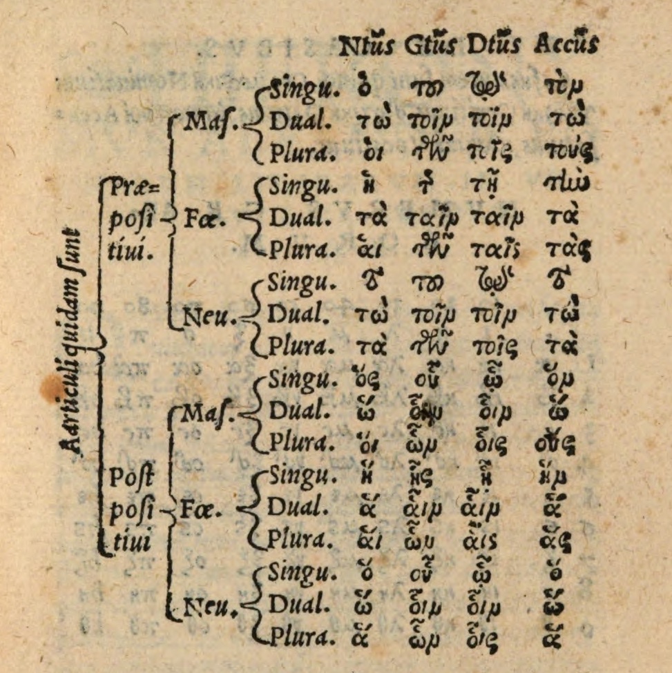 The declension of “prepositive articles” (the definite article) and “postpositive articles” (the relative pronoun) from the 1532 edition of Girolamo Aleandro’s Elementale introductiorum in nominum et verborum declinationes graecas, first published in 1509:
