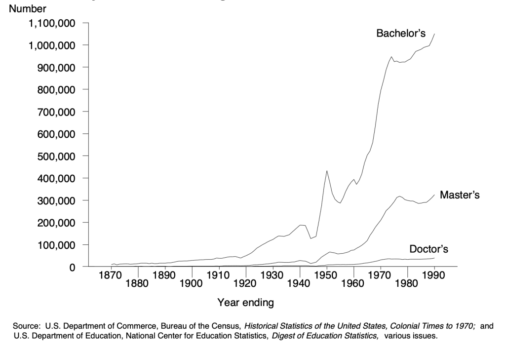 College enrollments in the U.S. surged after WWII. The G.I. Bill of 1944 helped veterans pay for college, which led to a spike in enrollments in the second half of the 1940s. Then, the 1960s saw unprecedented federal and state funding of higher education and growth of public university systems (Mintz, 2022). Furthermore, fear of the draft during the Vietnam War encouraged many to continue on to college, and stay there, who might not otherwise have done so.