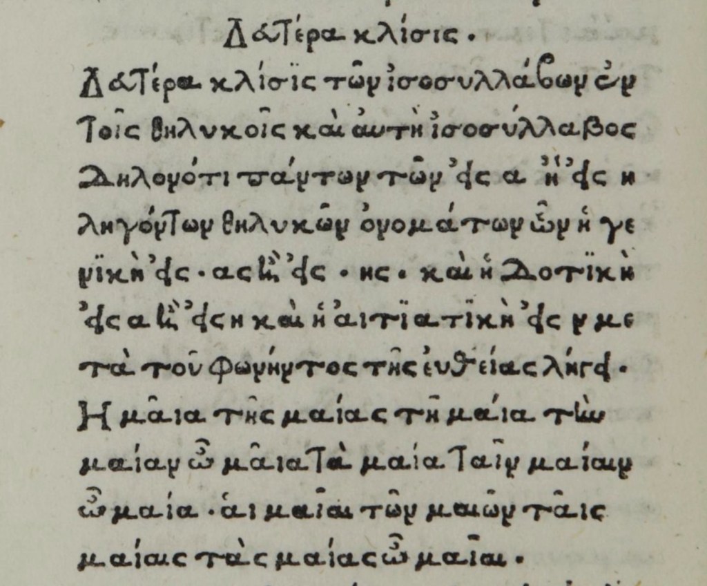 Meanwhile, William Camden’s Institutio Graecae grammatices compendiaria in usum regiae scholae Westmonasteriensis, first published in 1595, would become the standard Greek textbook in the English-speaking world. Here is a sample from the 1833 edition: