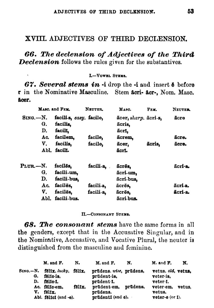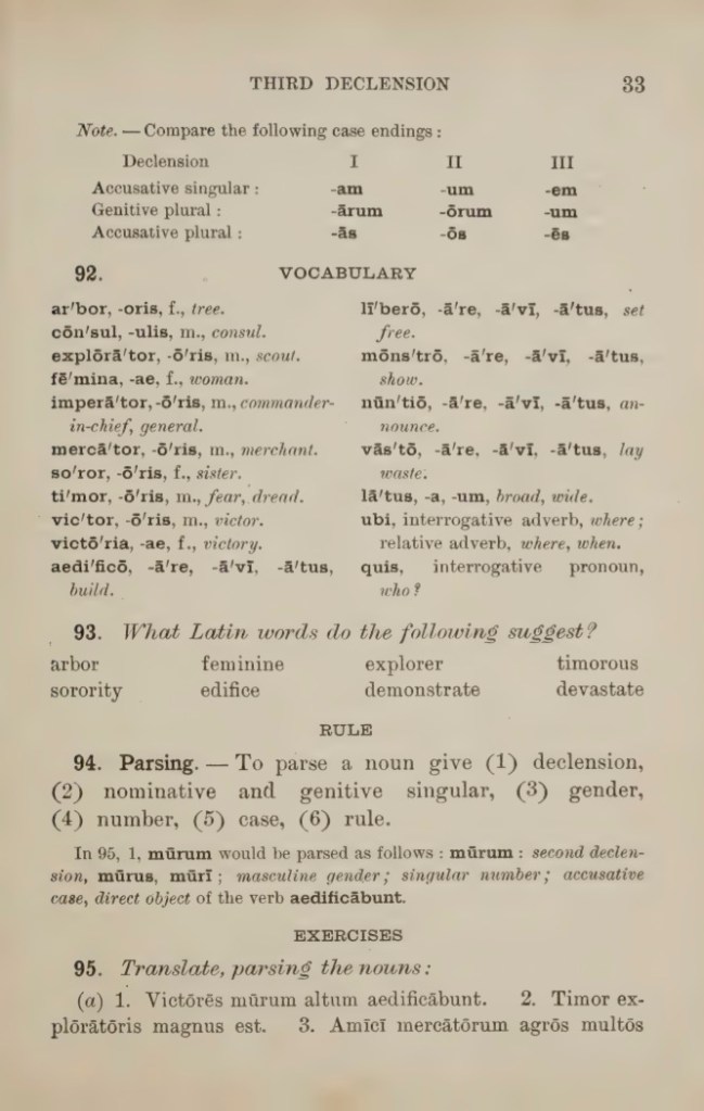 Beginning with Minnie L. Smith’s Latin Lessons, first published in 1913, teachers in the U.S. produced high school materials that would variously be revised, expanded, abridged, and combined over the decades to become the Jenney Latin series, the most popular grammar-translation approach textbooks for high school Latin in the 20th century (Castle, 2023). Here is Lesson X on the third declension from Smith’s original Latin Lessons (32-34):