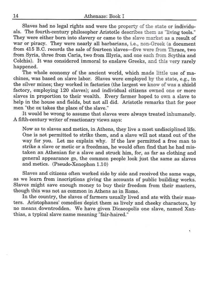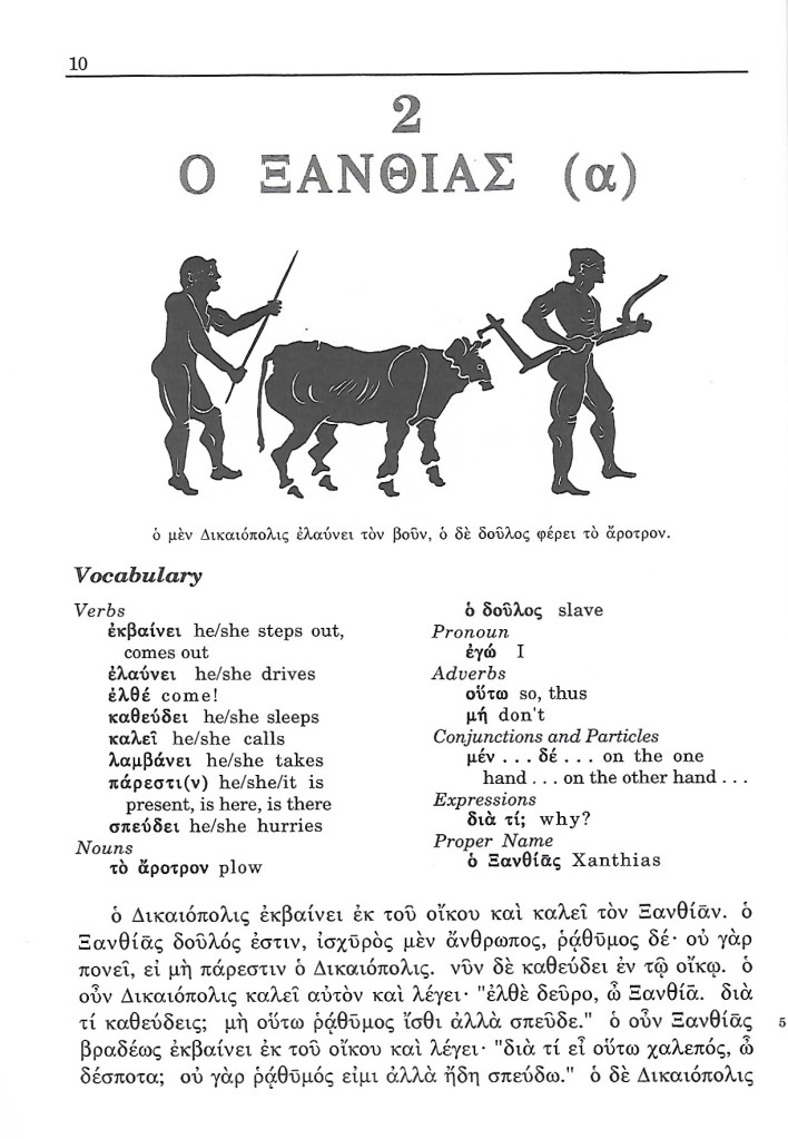 Andrew Keller and Stephanie Russell published Learn to Read Latin in 2004 and Learn to Read Greek in 2012. Inspired by the thoroughness of Moreland & Fleischer and Hansen & Quinn, they wanted textbooks that would introduce students to classical authors throughout their first year of study, not just at the end, hoping that students would continue beyond the first year of study when they see what sort of literature they can be reading. To do this, exercise sentences are thorough, and chapters conclude with heavily glossed authentic texts. Here is the end of Chapter 4: