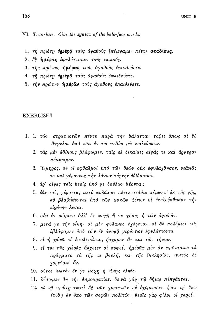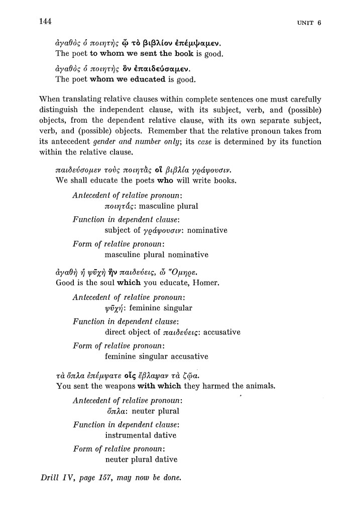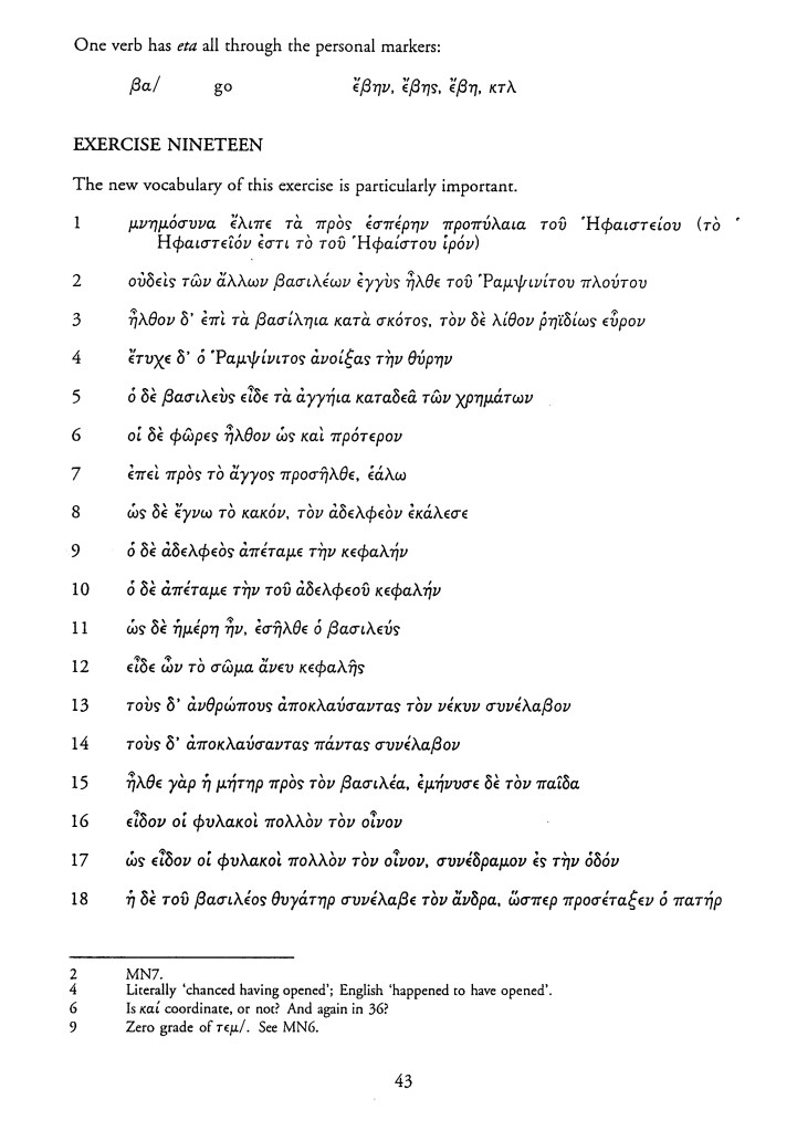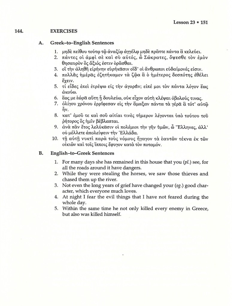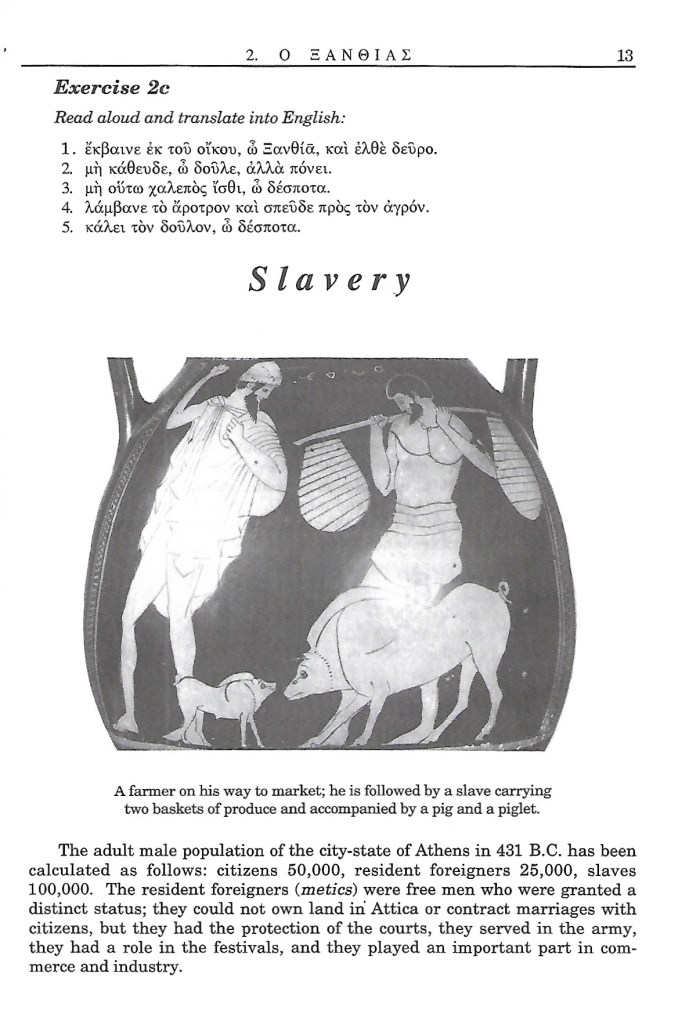 To consider Lesson XLIV (145-148) for example, we find a quote from Diogenes, relatively basic grammar explanation, abundant exercise sentences, adapted Plutarch, a photograph of a Parthenon frieze, and at least one connection to English (“The suffix -σις, both in Greek and in English, denotes a name of an action,” 148):