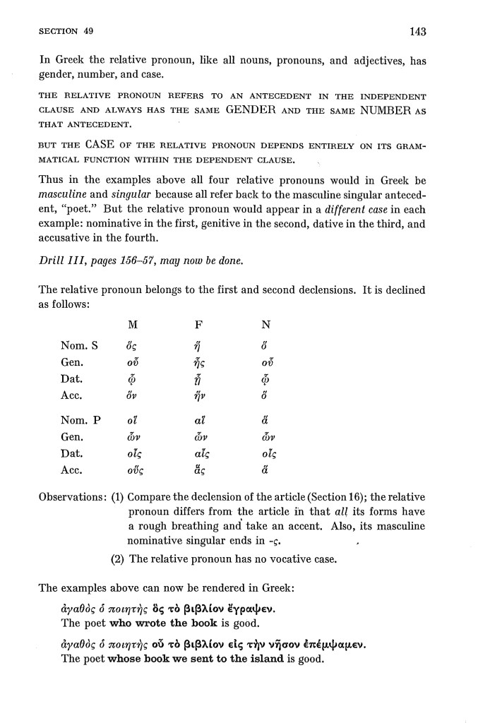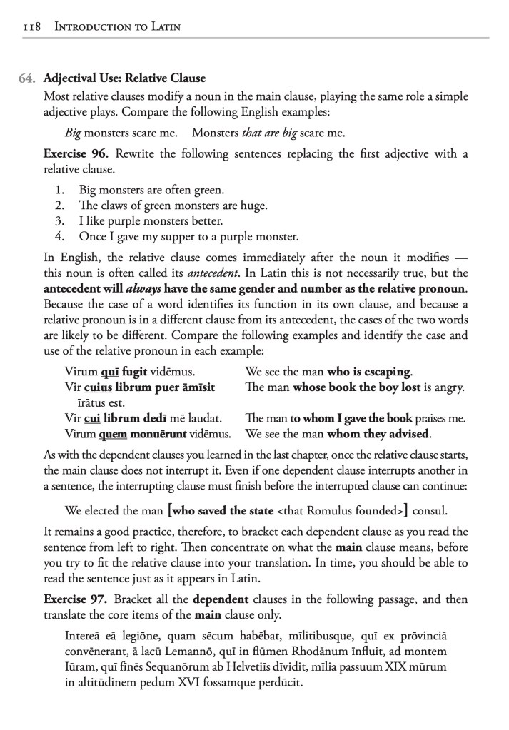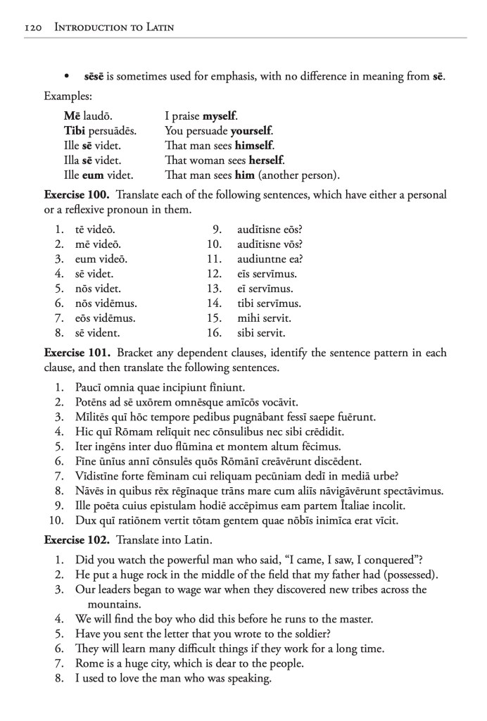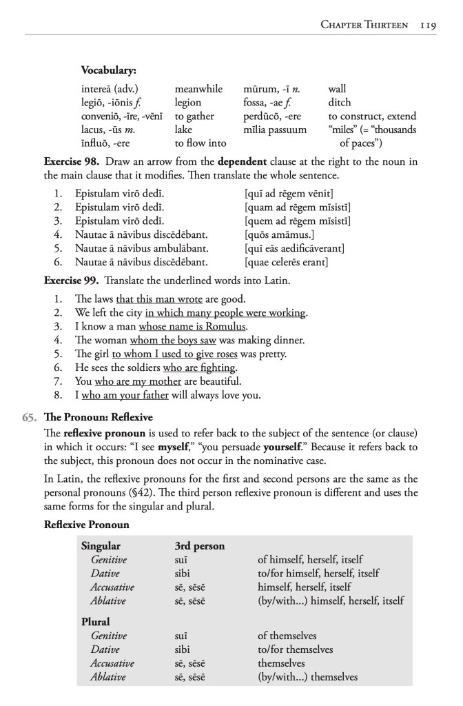 Taking a different approach, the Shelmerdine sisters separately published textbooks on Greek (by Cynthia, 1st edition in 2001) and Latin (by Susan, 1st edition in 2005) using a bare-bones grammar-translation approach with more types of exercises and extended readings than the standard textbook of the sort. Though still the underdog, Shelmerdine’s Introduction to Latin now competes with Wheelock’s Latin. Here is most of Chapter 13 on the relative and reflexive pronouns from the 2013 2nd edition: