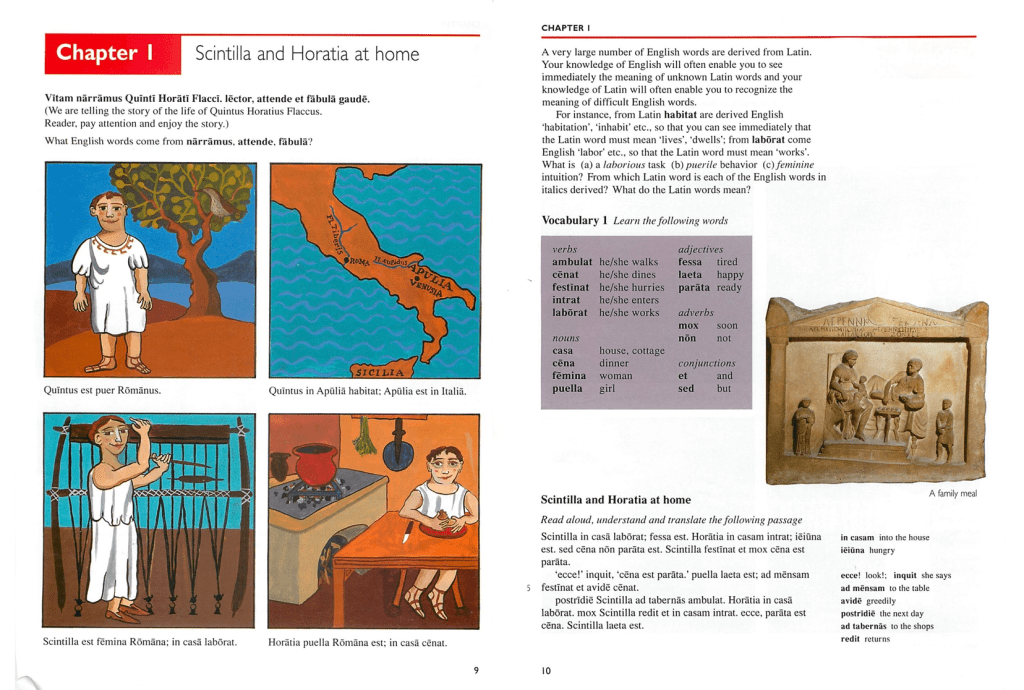 In response to the enrollment crisis of the 1960s, in 1970 and 1971 the Cambridge School Classics Project published five books of the Cambridge Latin Course (hereafter the CLC) in the UK. The first three books follow the life of a fictional Quintus, who survives the eruption of Vesuvius, travels to Alexandria, then relocates to Britain. The last two books concern the intrigues of a different aristocratic family in Rome.